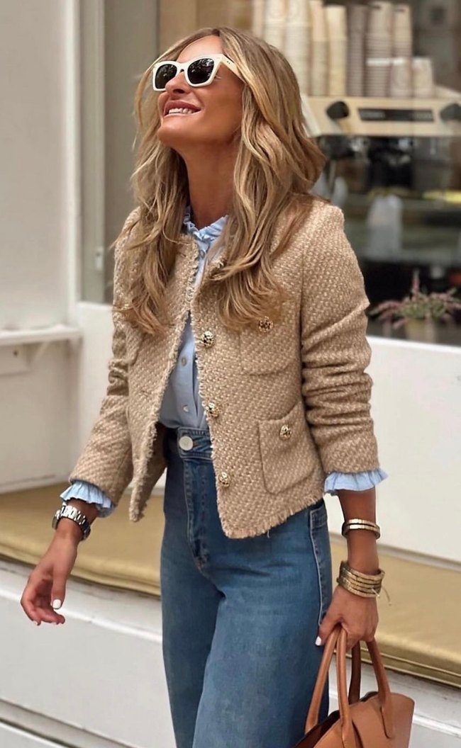 Bej renkte, düğmeli kısa kesim kadın blazer ceket. Uzun kollu, kesik yakalı ve denim kumaştan üretilmiştir. Günlük rahat kullanıma uygundur. ✨