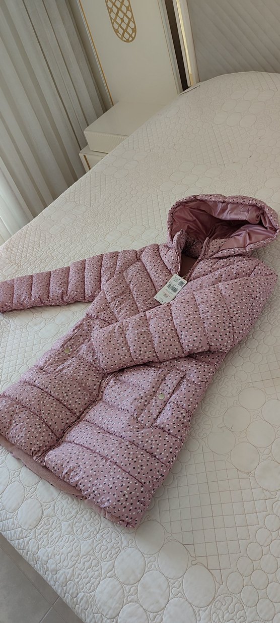 Mango kız çocuk mont 13-14 yaş sıfır/etiketli ürün. Kız çocukları için pudra renginde, kapüşonlu ve kürklü detaylı, desenli, sentetik kumaştan yapılmış sokak stiline uygun pastel tonlarda.
