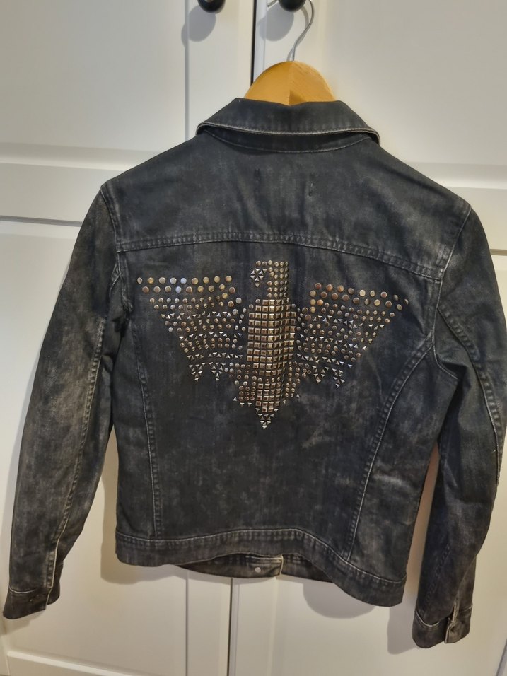 Düğmeli önü,eskitilmiş kot kumaşı uzun kollu denim ceket, normal boyda.Arkası yapıştırma zımba desenli çok şıktır.Bedeni olmadığı için pek kullanamadım.Ölçüleri fotolarda mevcut.İade yoktur.