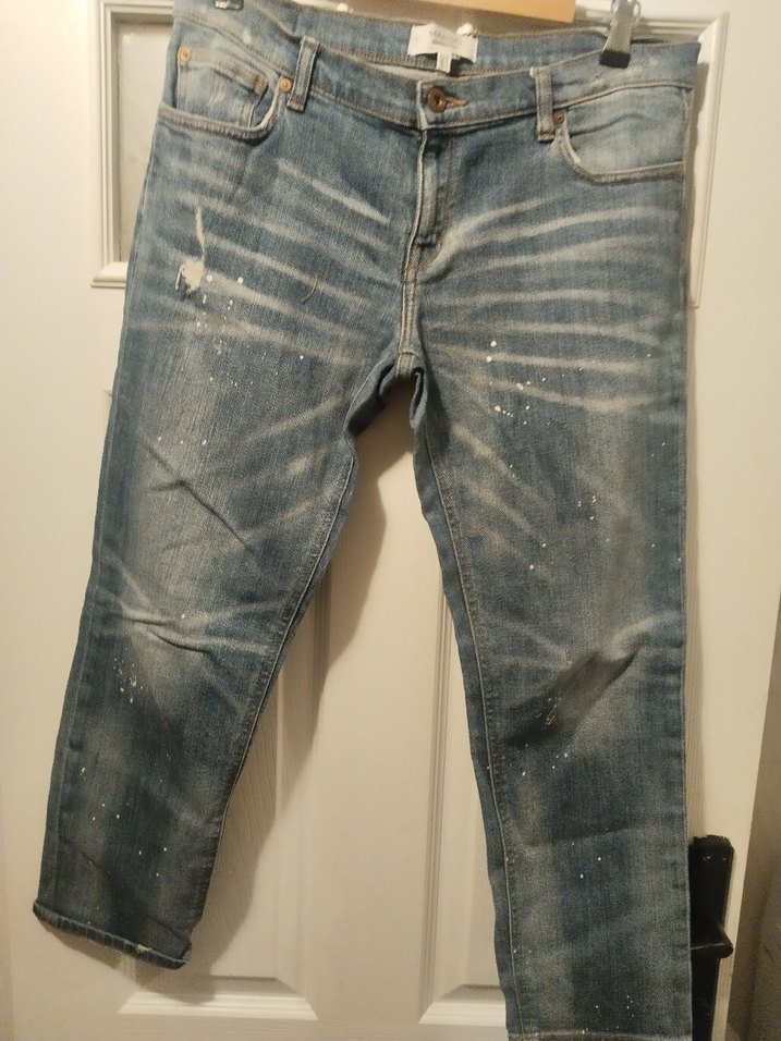 Mavi renkli, hafif boya sıçratma detaylı, günlük kullanım için uygun sokak stili pantolon.