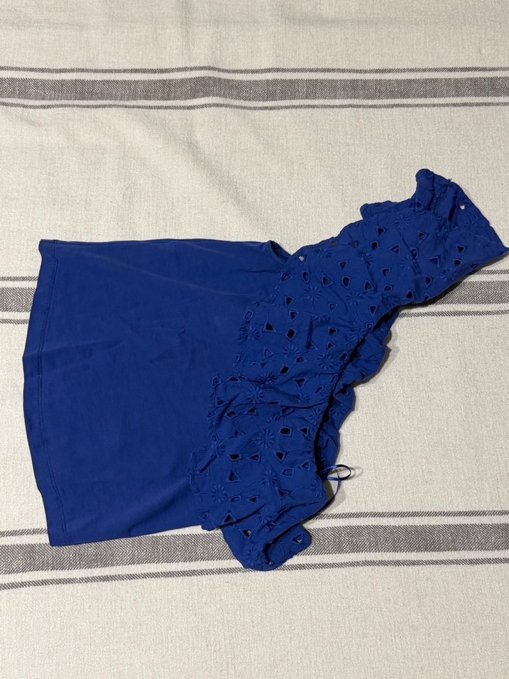 Fitted kesim, Mango koyu mavi küpür detaylı tek kol tişört Tertemizdir ( 1 kez giydim ) Xs ama bence small uyumlu ( bana belden biraz bol geldi) Esnek kumaş İç göstermez Kolu düşme yapmaz lastikli Hiçbir defosu yoktur