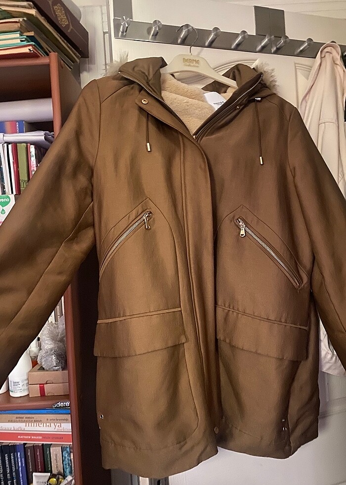 Mango taba rengi kürklü parka-mont-kaban. İçi kürklü, şapkasında da kürk mevcut. Şapkasının kürkü isteğe bağlı çıkarılabiliyor. Aksesuarlarında vs hiçbir kararma yok. Hiç giyilmedi o yüzden defolu da değil. Sıfırdan farksızdır.