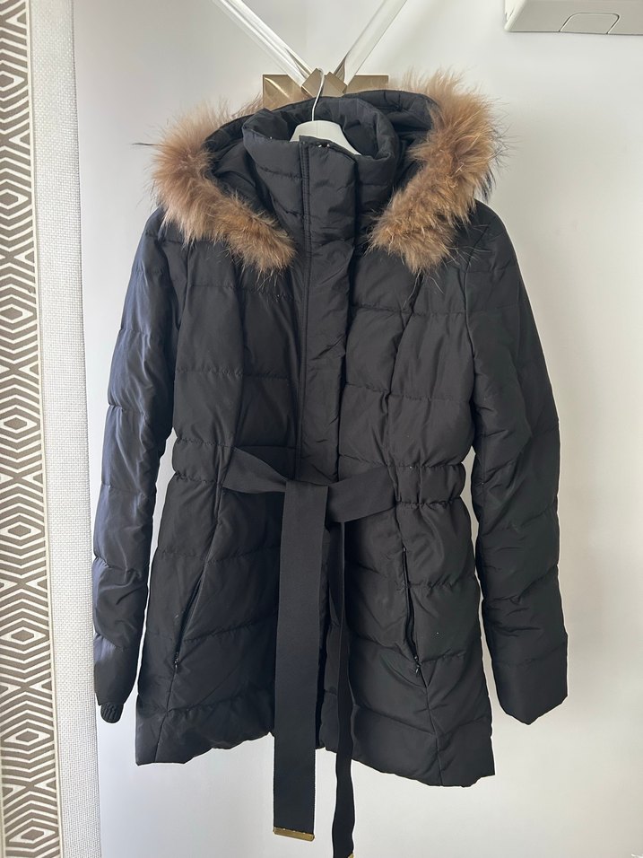 Kürklü kapüşonu ve kemerli beliyle siyah kadın kışlık mont. Notched lapel yakası ve askılı kolları, yumuşak sentetik kumaştan üretilmiştir. Genç ve trend dış mekan kullanımı için uygun. ❄️ İki koltuk altı arası 50 cm. Boy (omuzdan aşağıya kadar) 75 cm. Kapüşon gerçek kürklü. Kürk çıkarabiliyor. Montu 30 derecede makinada yıkayabiliyorsunuz. Yumuşak ve rahat S ve M giyenlere uygundur.