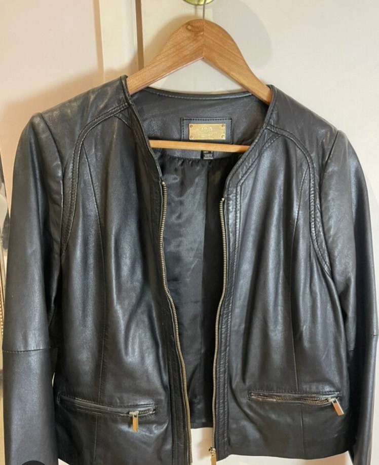 Fermuarlı, notched lapel yakalı, siyah fitted deri biker ceket. Uzun kollu ve normal boyda, ofis için uygun. sağ kolda bir yırtık altına deri koyularak yapistirildi tamir edildi ve sağ omuzda zede mevcut fotolarda görüldüğü gibi kullanım a engel değildir uygun listeledim