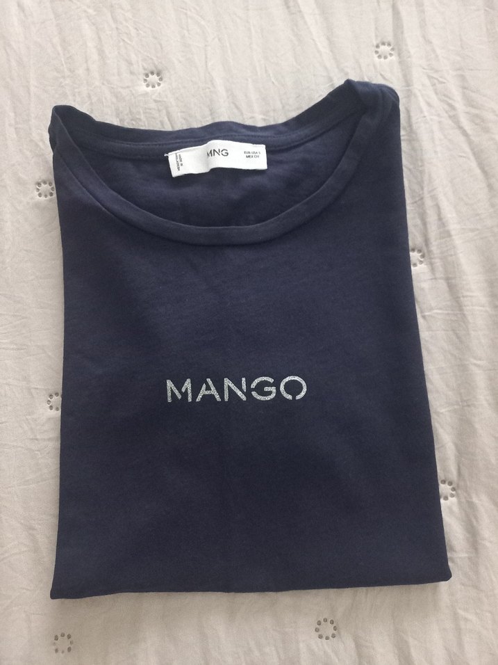 Lacivert Mango tişört, yuvarlak yaka, kısa kollu ve pamuklu kumaştan, rahat kesimli. Minimalist baskılı tasarımıyla zahmetsiz şıklık sunar. S beden 1 kez giydim hiçbir hasarı yoktur.