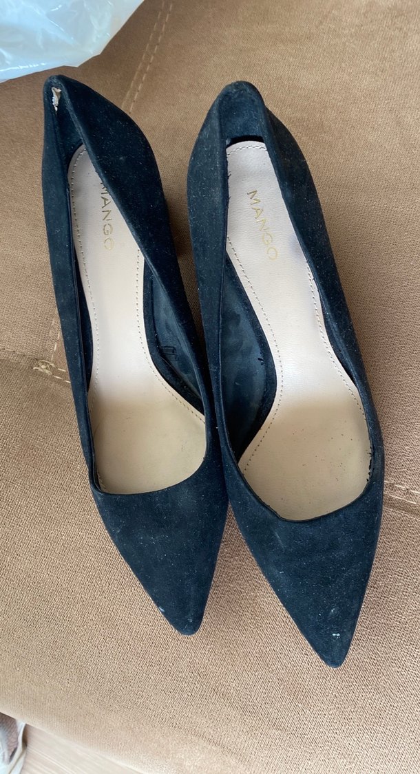 Mango marka, lacivert süet malzemeden yapılmış, sivri burunlu ve minimalist tasarımlı stilettolar. Ofis kullanımı için uygun, şık ve rahat bir model.
