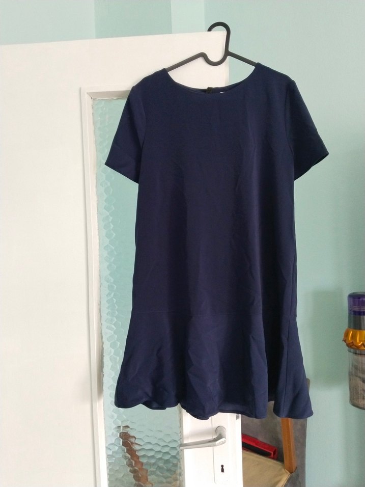 Lacivert midi elbise, kısa kollu, yuvarlak yakalı ve bol kesimdir. Yumuşak sentetik kumaştan, sade ve desen içermeyen minimalist tasarıma sahiptir.
