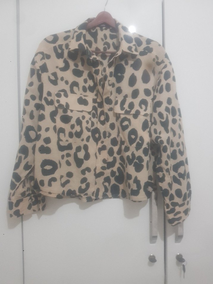 Uzun kollu, yakalı ve düğmeli kadın gömlek. Bol kesim, kısa boy, kahverengi ve gri leopar desenli, yumuşak sentetik kumaştan, rahat dış mekan kullanımı için uygun.