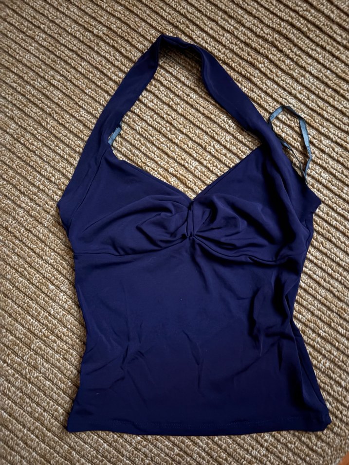 Lacivert renkli, V yakalı ve drapeli detaylı, yumuşak sentetik kumaştan yapılmış, normal boyda ve dar kesim