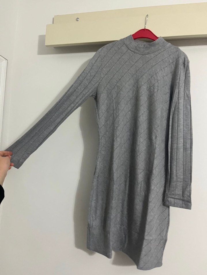 Gri, yüksek yakalı, uzun kollu, triko midi elbise. Mango marka açık gri renk L beden sorunsuz elbise. İki kol altı 47cm , bel 41cm, kalça 44cm, elbise boyu 87cm, kol boyu 59cm. Açılabilendir. üzerinize göre genişler yani