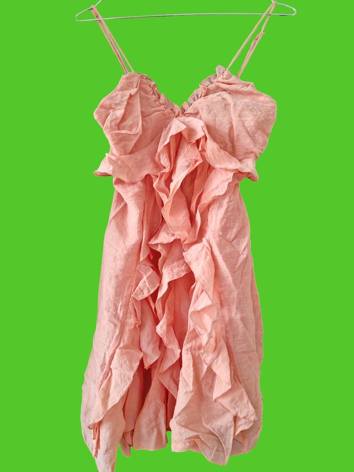 Uçuş uçuş bir elbise, iki veya üç defa giyildi. İçinde ince bir astar mevcuttur. Ön kısmındaki fıtfırlar arkasında mevcut değildir.