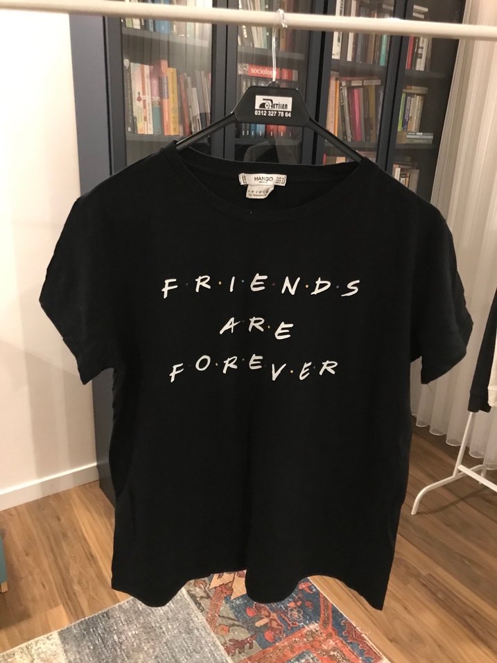 Pamuk siyah tişört, kısa kollu, bisiklet yaka ve bol kesim. Üzerinde "FRIENDS " baskısı bulunur. Rahat ve şık sokak stili için uygundur.