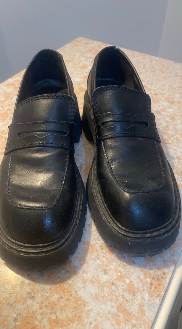 Siyah renk ve blok topuklu kadın loafer. Dayanıklı kauçuk malzemeden, klasik goth tarzında, ofis kullanımı için uygun.