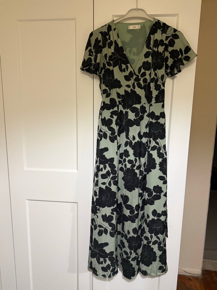 Yeşil renkte, siyah çiçek desenli, kısa kollu, V yakalı, bol kesim ve dökümlü uzun elbisedir. Saten kumaştan S beden Mango marka elbise.