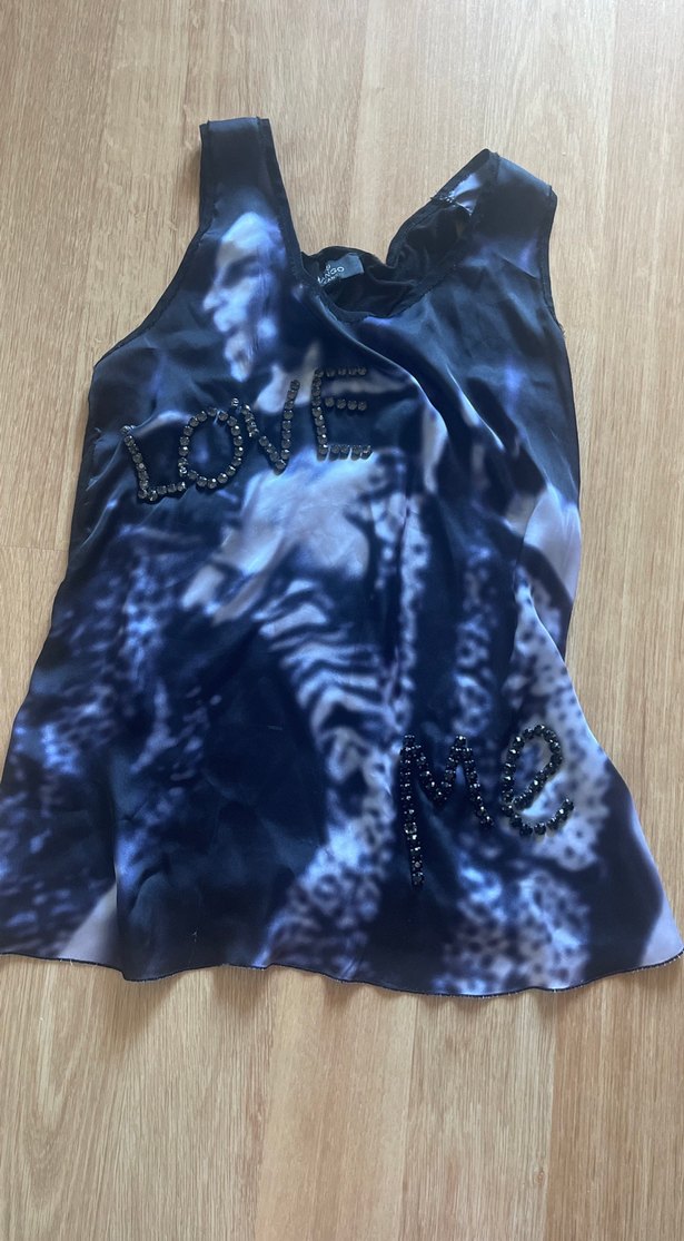 Koyu mavi batik desenli, payet işlemeli "LOVE ME" yazılı, V yaka ve kolsuz atlet Geniş kesim ve gotik tarzda, modaya uygun.