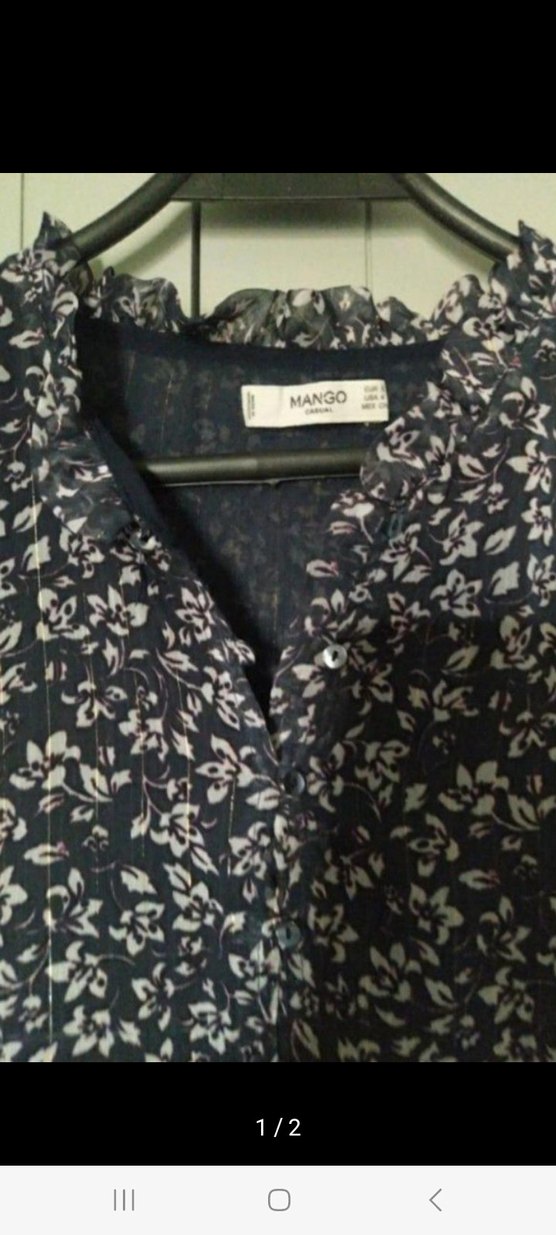 Mango marka, mavi çiçekli baskılı, V yakalı ve düğmeli kısa kollu, bol kesim günlük rahat bluz.