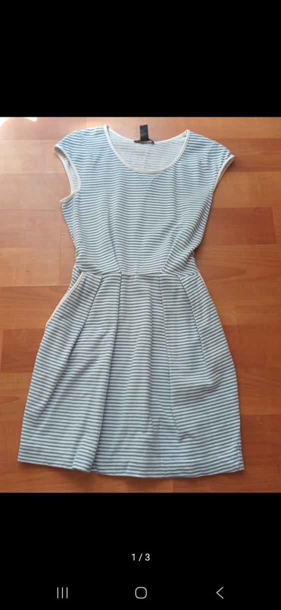 Gri çizgili, kolsuz ve tekne yakalı bu midi elbise, pilili detaylara sahip ve yumuşak sentetik kumaştan üretilmiştir. Neredeyse hiç kullanılmamış durumu çok iyi.