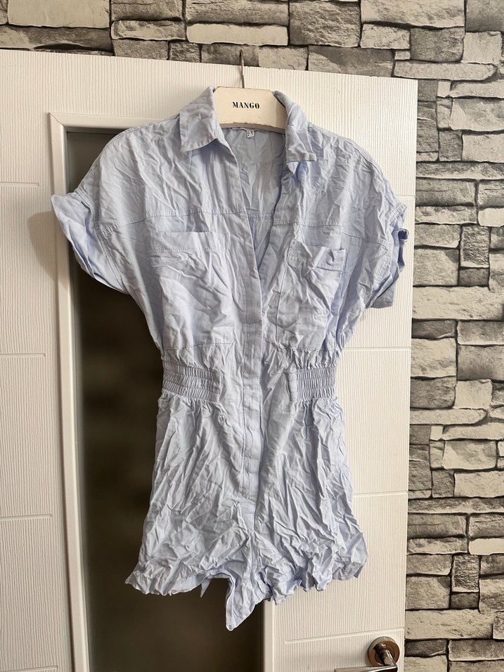 Yumuşak keten kumaştan, bol kesim kısa tulum. Kısa kollu, yakalı ve düğmeli detaylara sahip. Düz mavi renk, günlük sokak modasına uygun.