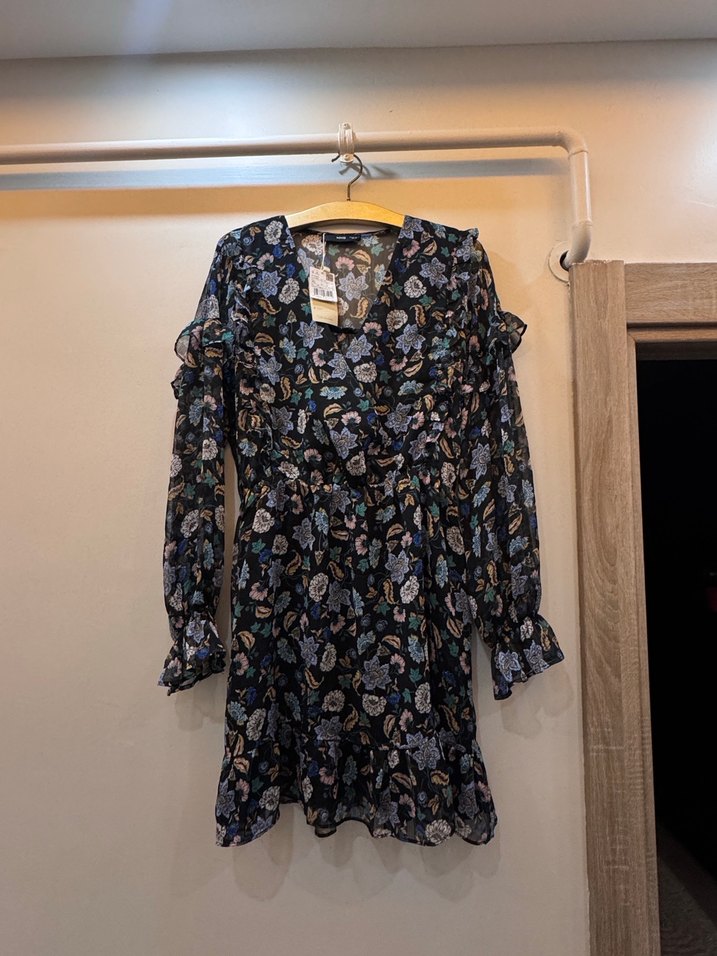 Uzun kollu, volan detaylı bohem midi elbise. Sentetik kumaştan, salaş kesim ve koyu çok renkli batik desenlidir. Günlük kullanım için uygundur.