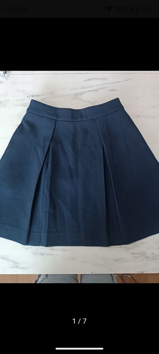 Lacivert renkte, pilili ve sentetik kumaştan yapılmış, ofis için uygun, sade ve dar kesim mini etek.