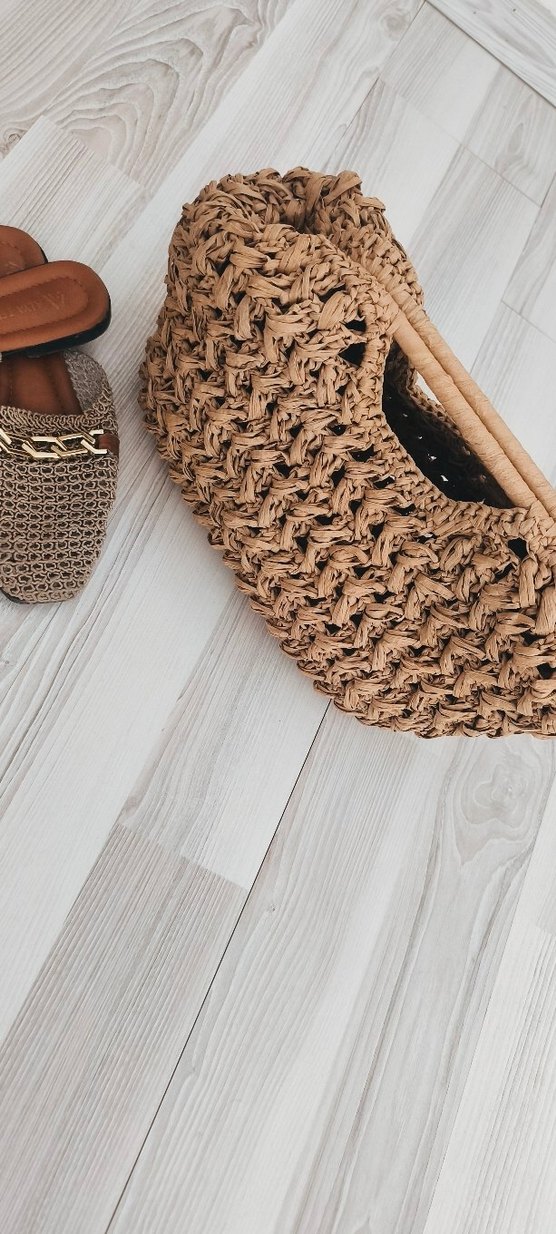 Bej renkte, örgü dokulu kadın çantası, bohem tarzda ve desensiz, günlük kullanıma uygun.