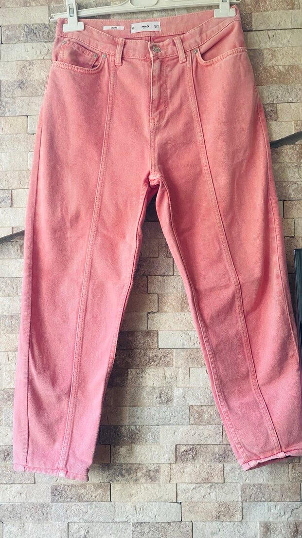 Pastel pembe renkte, normal boy midi uzunluğunda, desen içermeyen mom denim kot pantolon. Rahat kesimi ve sokak stiline uygun tasarımıyla günlük kullanıma uygundur. İyi durumdadır paçaları tadilatlı. İadesi yok.