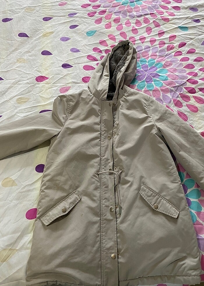 Diğer uygulamadan aldık, ama kızım modelini yakıştıramadığı için giymedi, üzerindeki ufak leke vardı aldığımda da, cok belli olmuyor. Yıkanınca cıkar.. içi full peluş, su almaz. Parka gibi,