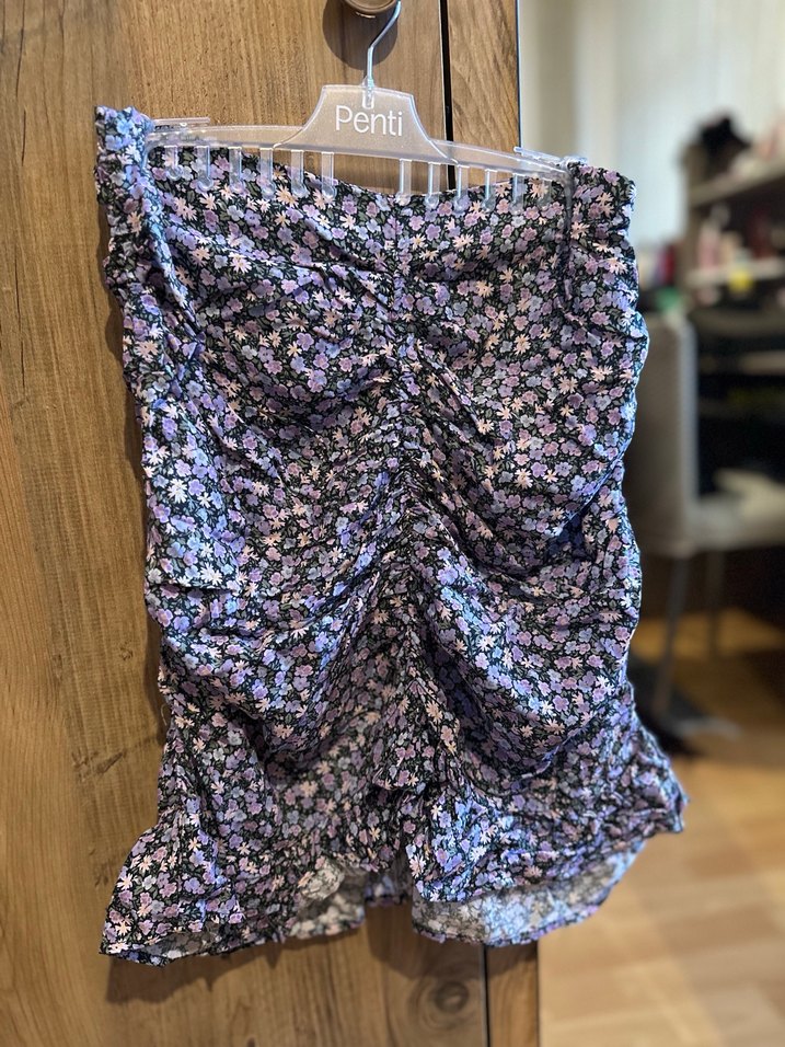 Drapeli tasarımı ve koyu mor çiçek deseniyle, sentetik kumaştan yapılmış, vücuda oturan midi mini etek. Bohem tarz için uygun.