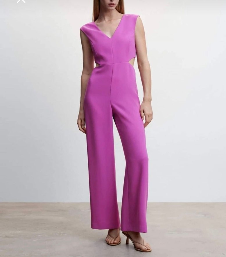 Mor renkte, V yakalı ve yan yırtmaçlı, kolsuz uzun tulum. Ofis için uygun, yumuşak sentetik kumaştan yapılmıştır.