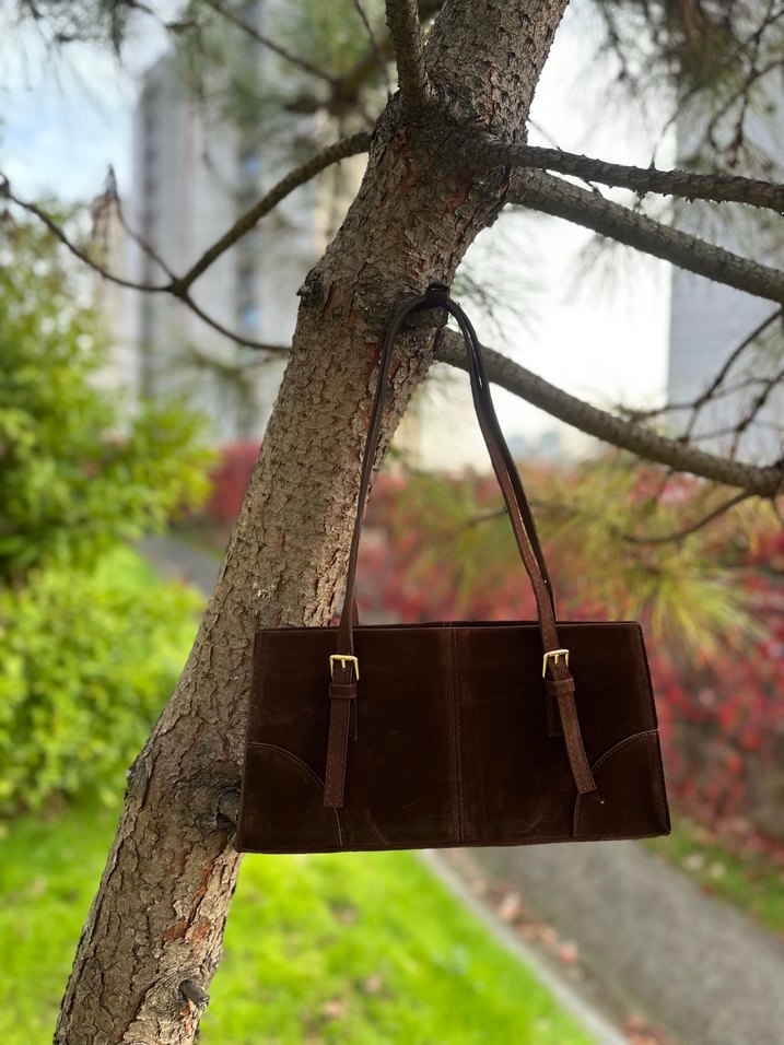 Kahverengi süet malzemeden yapılmış, tokalı askıları ve minimalist tasarımıyla günlük kullanıma uygun şık kadın omuz çantası. Marka temsili
