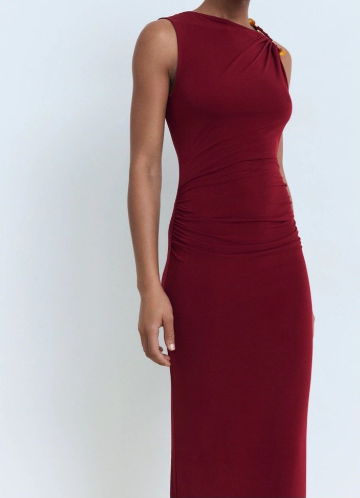 Drapeli bisiklet yaka ve kolsuz tasarıma sahip, vücuda oturan midi elbise. Bordo renginde, yumuşak sentetik kumaştan, minimalist ve çağdaş bir görünüm sunar.