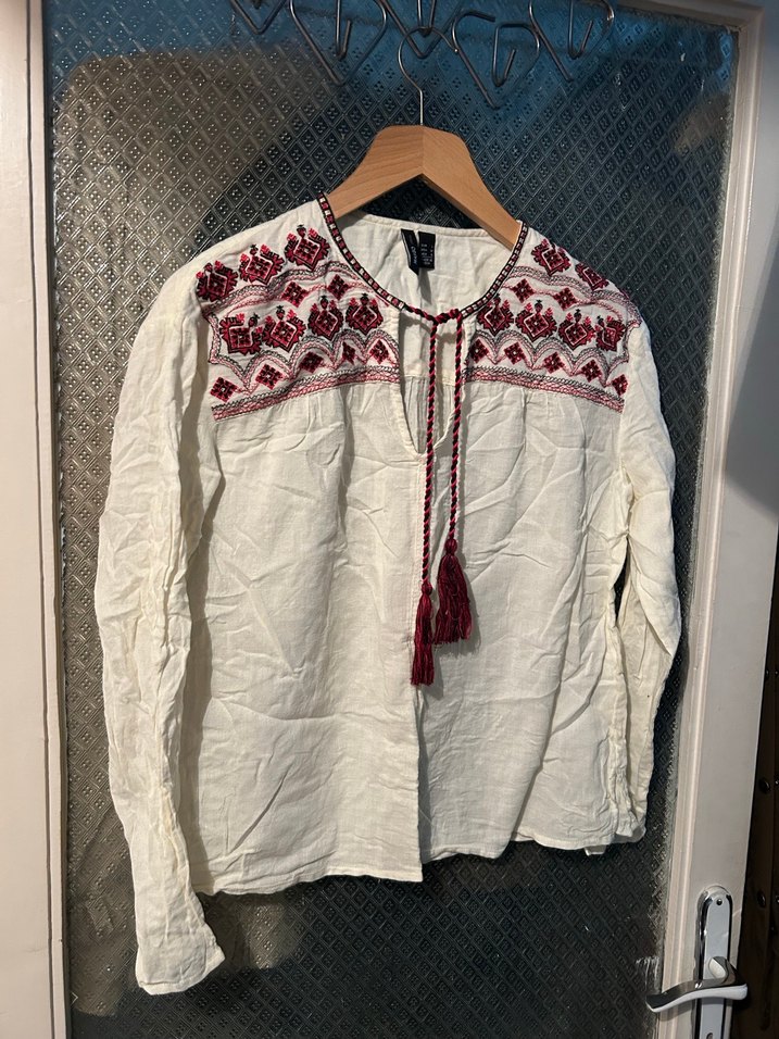 Mango etnik bluz. Hiç kullanılmadı, hurçta durduğu için kırışmış biraz. Krem rengi. Yüzde yüz pamuk. Koltuk altından koltuk altına 57 cm, boyu 61-62 cm #mango #etnik #bluz