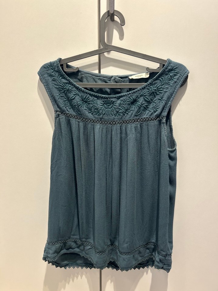 Mango Casual marka, %100 viskon kumaştan yazlık bluz. Ön kısmı zarif nakış detaylı, arka kısmı düğmeli ve alt bölümü yırtmaçlıdır. Dökümlü yapısı sayesinde hem rahat hem şık durur. Günlük kullanımda, yaz akşamlarında veya bohem kombinlerde çok hoş bir parça. • Beden: M • Kumaş: %100 viskon • Kondisyon: Çok iyi • Kusur: Yok