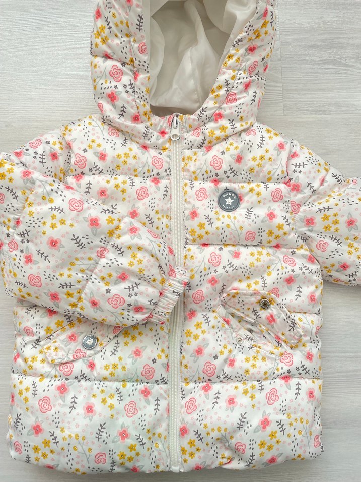Mango Kız Çocuk Mont, Orjinaldir, Az kullanılmıştır, Herhangi bir deformasyon yoktur, Ceplidir, İçi polarlıdır, Detaylı iç etiket fotoğraflarda mevcuttur, En:36 cm, Boy:38 cm, 3-4 yaş, Beyaz üstü mini çiçekli