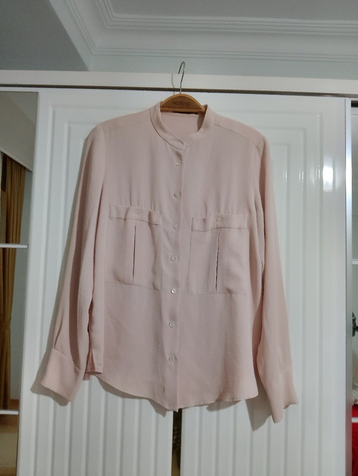 Bej renkli, düğmeli, uzun kollu kadın gömleği, bol kesim ve yakalıdır. İpeksi kumaştan yapılmış, minimalist ve normcore tarzıyla ofis kullanımı için uygundur. yeni dokusu mükemmel