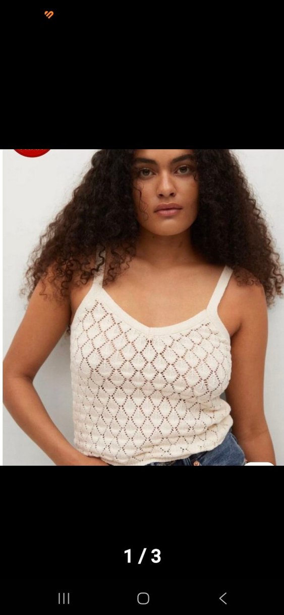 Bej renkte, V yakalı ve dantel desenli örme kumaştan yapılmış kadın crop top. Kolsuz ve bol kesimli, günlük sokak stiline uygun rahat bir parça.