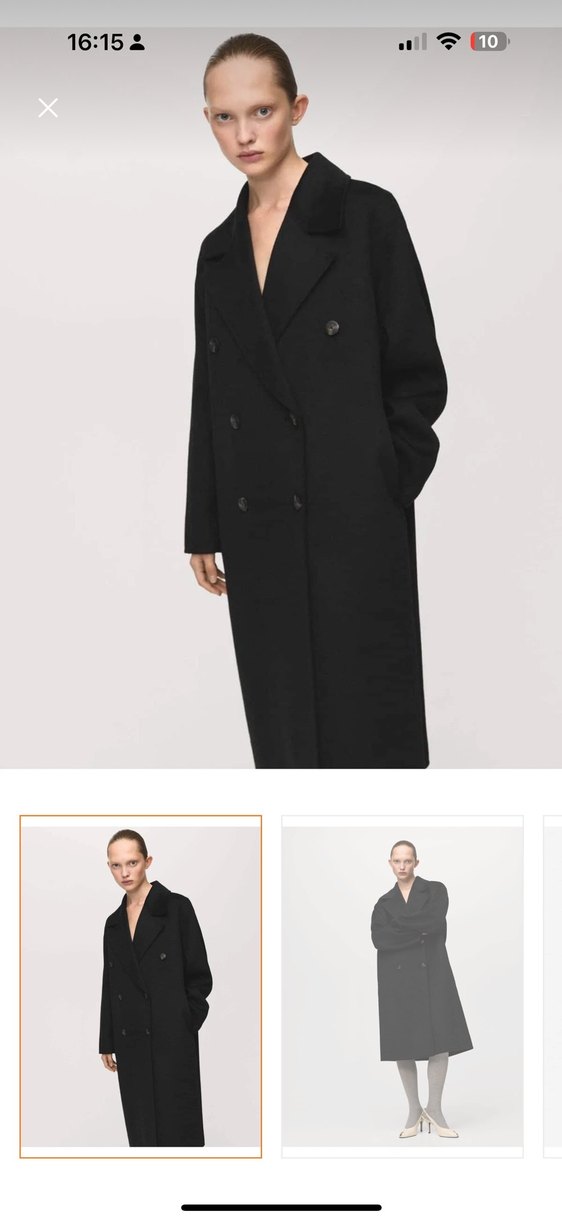 Bu siyah kaban, çift düğmeli tasarıma ve uzun kollara sahiptir. Klasik yakalı ve düz kesimli, zamansız bir görünüme sahiptir.