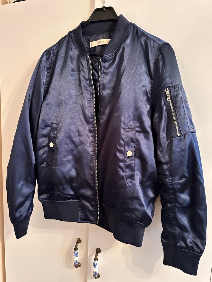 Parlak mavi saten kumaştan, fermuarlı ve uzun kollu, salaş kesim kadın ceket. Notlu yaka ve midi boy ile günlük kullanıma uygun.