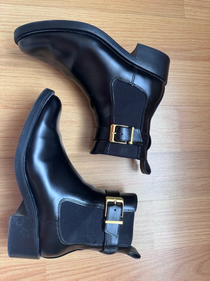 Mango Parlak siyah deri kadın botlar, tokalı detay ve blok topuklu tasarıma sahiptir, günlük kullanım için uygun. Mango marka, 39 numara, sadece bir kaç kez giyildi #mango#bot