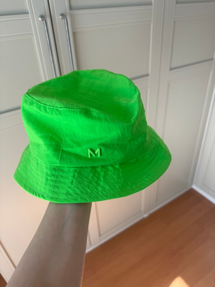 Parlak yeşil renkte, minimalist tasarımlı, velcro detaylı ve "M" işlemeli streetwear kadın şapka. Pürüzsüz sentetik kumaştan, trend belirleyici avant-garde tarz için uygun.