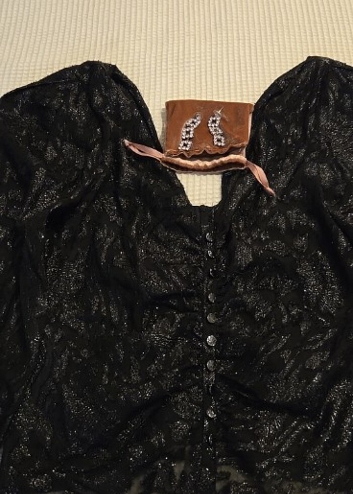 Mango kendinden yaldızlı ,derin dekolteli S beden gömlek.Pullu,ispanyol paça,beli lastili uzun paça 38 beden pantalon. Taşlı uzub küpe