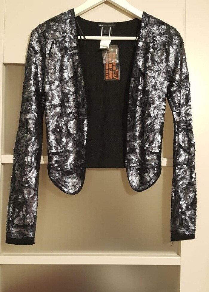 mango payetli gece ceketi. yilbasi icin uygun. siyah sik kumas uzeri gumus payetli. dugmesiz. yedek pullari mevcut iade almiyorum.#mango #payet #pul #gece #yilbasi #abiye #ceket #zara