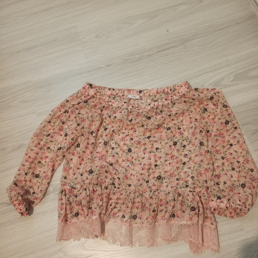 Mango 36 beden ,bol kesim kadın sifonumsu kumas bluz, uzun kollu ve kayık yaka detayına sahiptir. Fırfırlı ve pastel pembe desenli, yumuşak sentetik kumaştan yapılmıştır. Bohem tarz için uygundur.