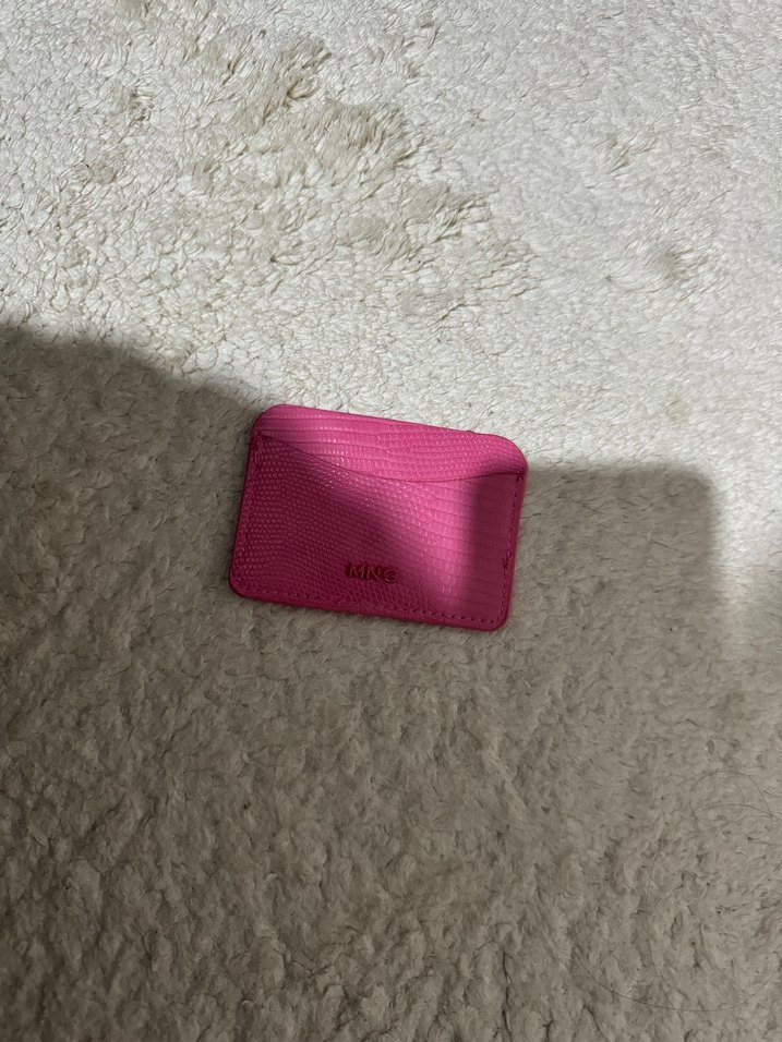 Mango Pastel pembe renkte, yılan desenli deri kadın cüzdanı. Velcro kapamalı, minimalist ve günlük sokak tarzına uygun.