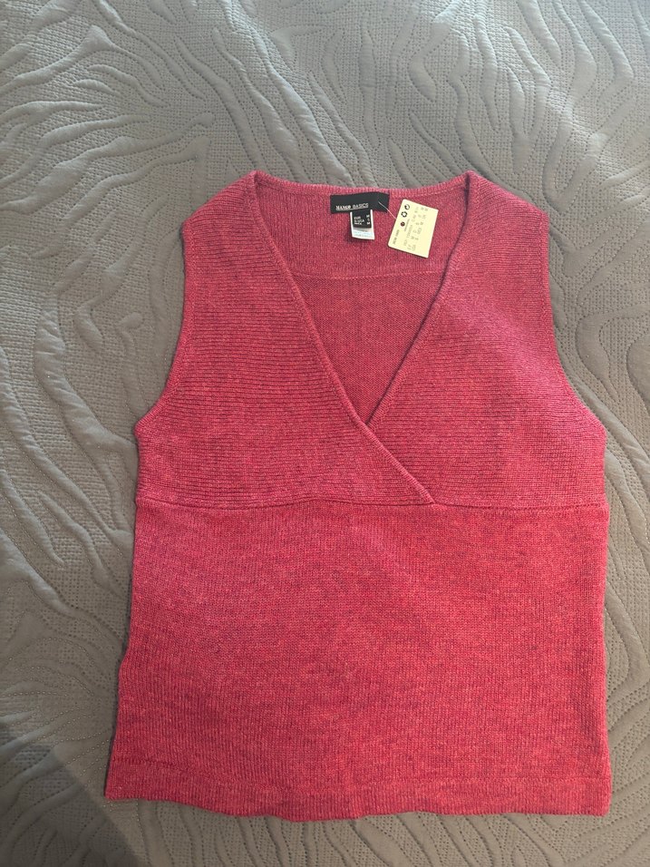 Pembe yün örme kumaştan, V yaka, kolsuz, normal boyda ve dar kesim kadın süveter. Rahat ve şık kullanıma uygundur.