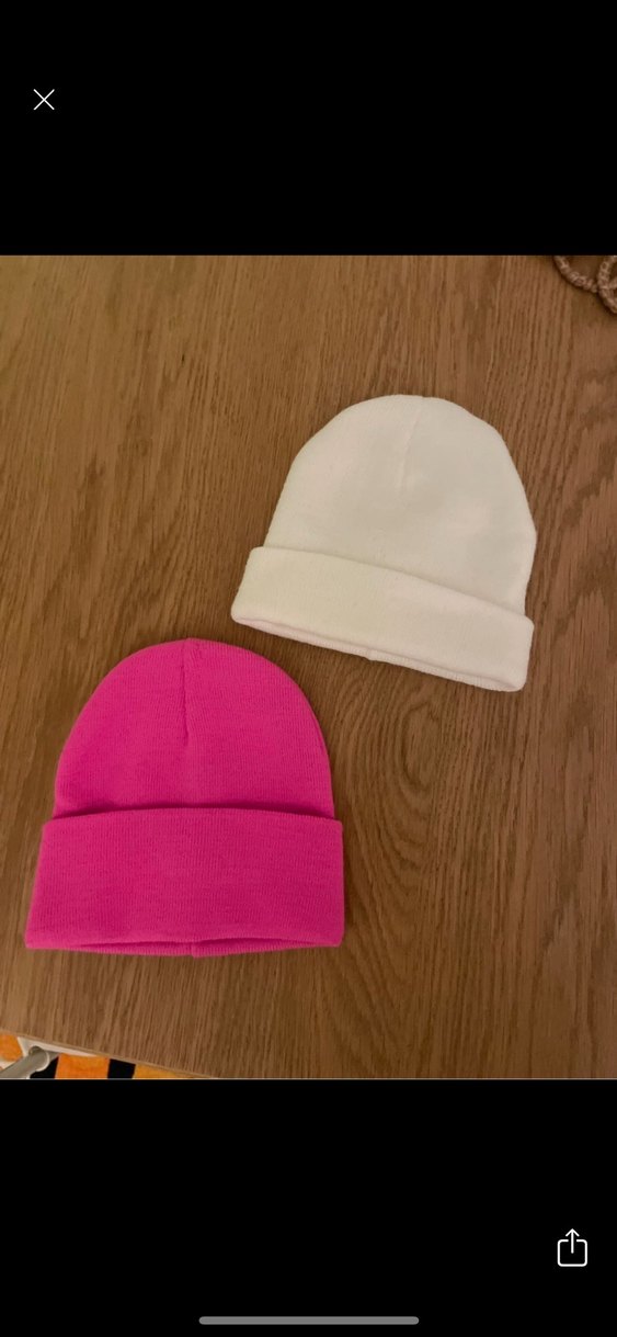 Pastel pembe ve beyaz renklerde, örgü ve yumuşak kumaştan yapılmış iki adet bere. Katlanabilir kenarları ile sıcak tutar.