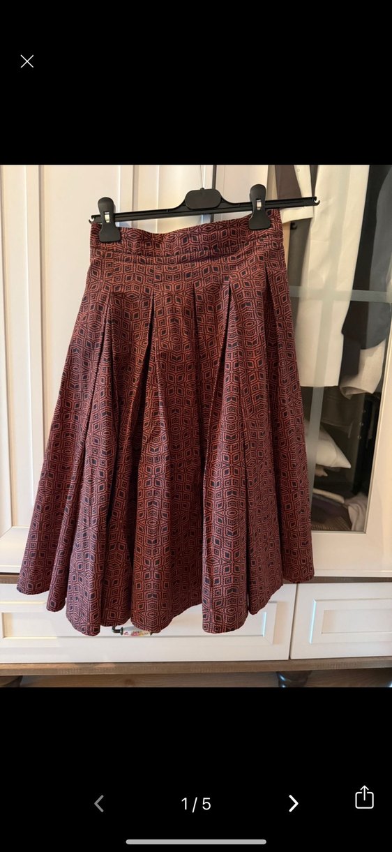 Bordo renkli, pileli ve bol kesim midi kadın etek. Yumuşak dokulu kumaştan, vintage desenli ve ofis için uygun bohem tarzda.