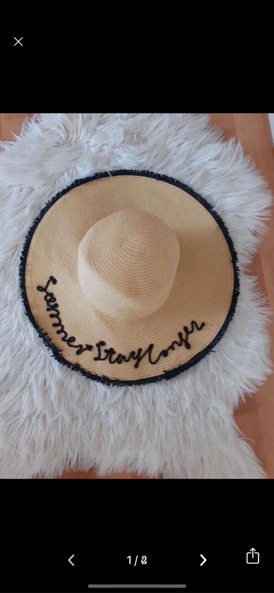 Sentetik kumaştan yapılmış, püsküllü ve siyah yazılı bej bohem tarzı kadın şapkası.