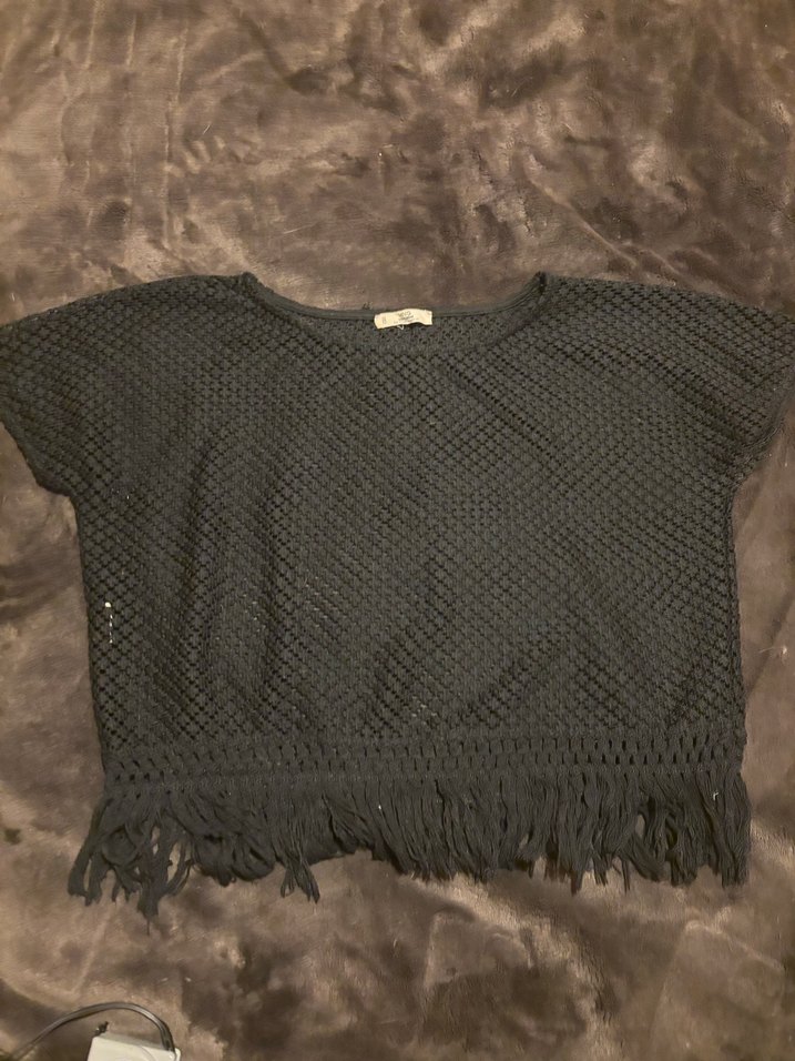 Siyah renkli, kısa kollu, yuvarlak yakalı örgü model bluz. Bol kesim ve saçak detaylı bohem tarzda.