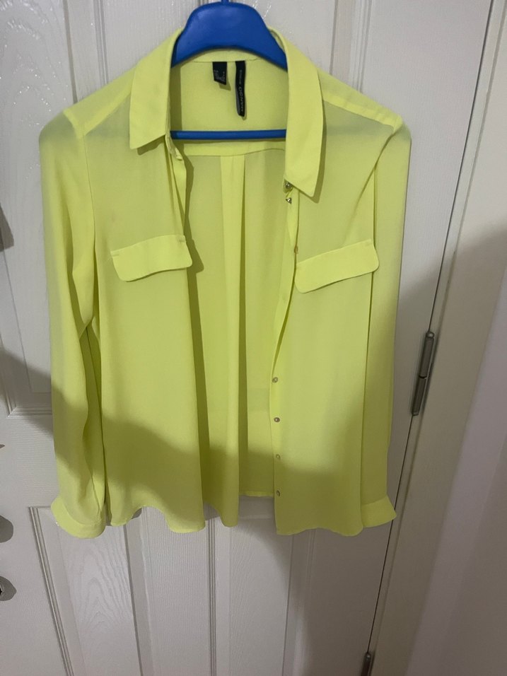 Açık sarı renk, düğmeli, uzun kollu, yakalı, bol kesim kadın gömleği, sentetik kumaştan, günlük rahat stil için uygun.